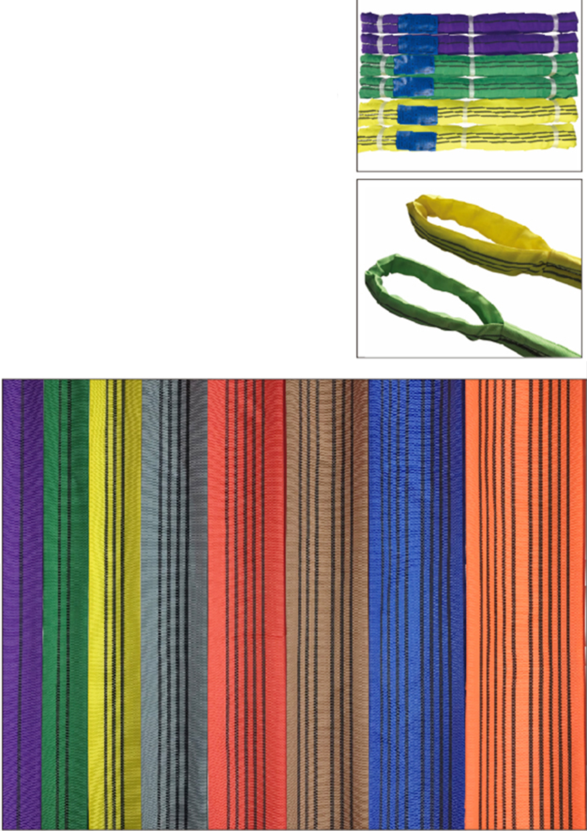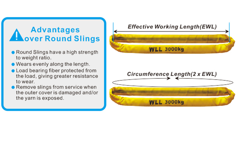تسمه های گرد مطابق استاندارد EN 1492-2 ساخته شده اند و دارای ضریب ایمنی 7:1 هستند. الیاف باربر به هم پیچیده می شوند تا یک بند بی پایان را تشکیل دهند. محدودیت بار کاری بر اساس تعداد چرخش در هنک تعیین می شود.